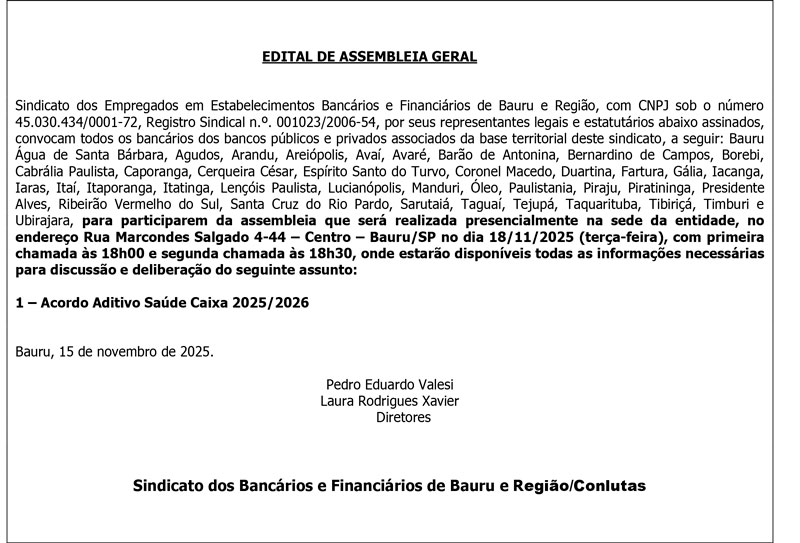 O Sindicato dos Bancários de Bauru e Região realizará em sua sede, no dia 18 de novembro, às 18h30 (horário limite), uma assembleia para discussão e deliberação da proposta de Aditivo ao Acordo Coletivo de Trabalho (ACT) do Saúde Caixa.