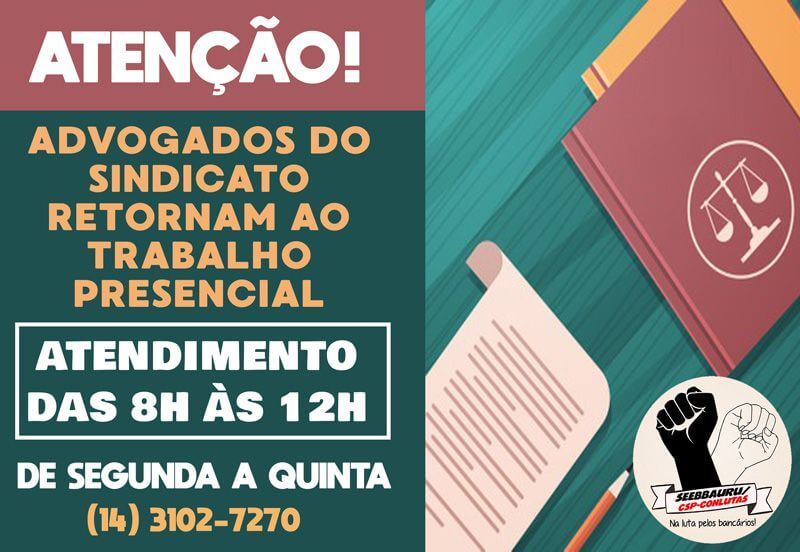 O Sindicato dos Bancários de Bauru e Região informa que os advogados da entidade retornaram nesta segunda-feira (13), ao trabalho presencial na entidade. Os atendimentos poderão ser agendados através do telefone: (14) 3102-7270.