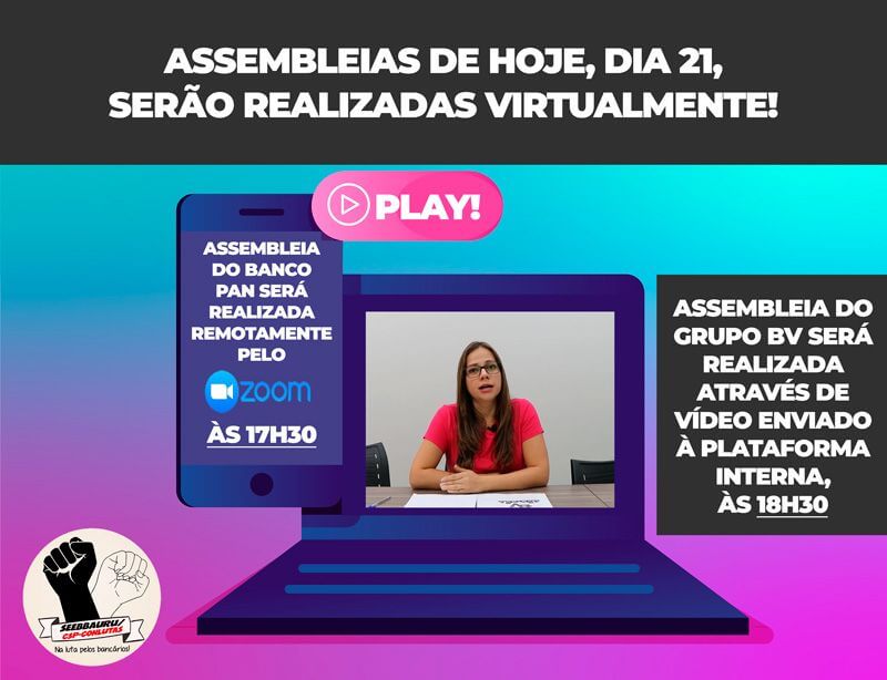 Hoje (21), o Sindicato dos Bancários de Bauru e Região irá realizar virtualmente as assembleias sobre os acordos aditivos do Banco Pan e do Grupo BV.