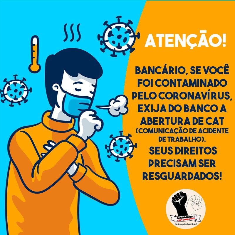 O Sindicato dos Bancários de Bauru e Região defende que bancários que contraírem o novo coronavírus exijam a imediata abertura de Comunicação de Acidente de Trabalho (CAT). Caso o banco se recuse, o bancário deve entrar em contato com o Sindicato.