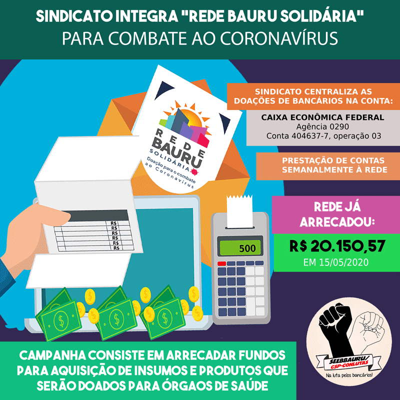O Sindicato dos Bancários de Bauru e Região faz parte da campanha “Rede Bauru Solidária”, que consiste em arrecadar fundos para aquisição de insumos e produtos que serão doados para órgãos de saúde no combate à pandemia de coronavírus.