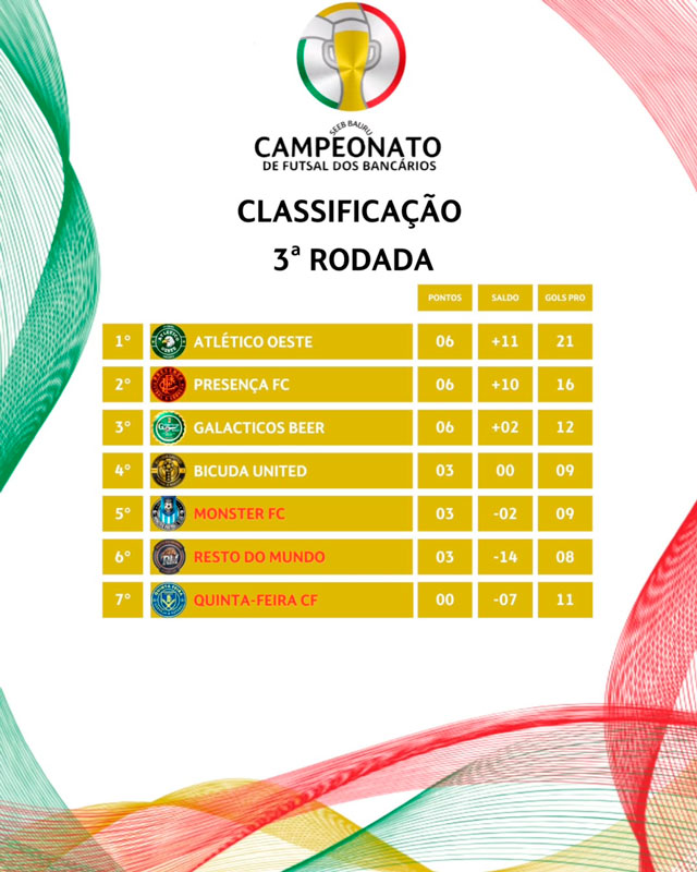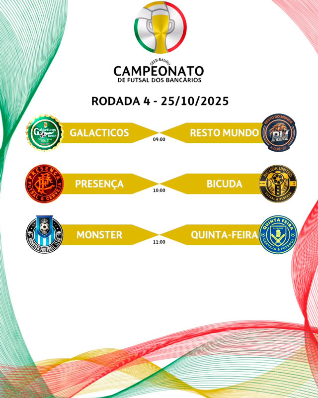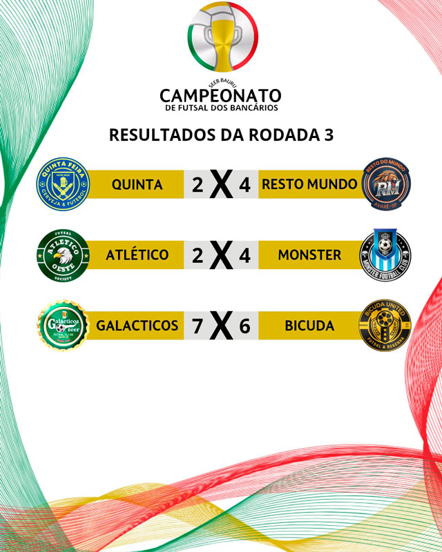 A 3ª rodada do Campeonato de Futsal do Sindicato dos Bancários de Bauru e Região aconteceu no dia 18 de outubro, com três grandes jogos que agitaram a quadra e garantiram muita emoção. As equipes seguem firmes na disputa pelo título.
