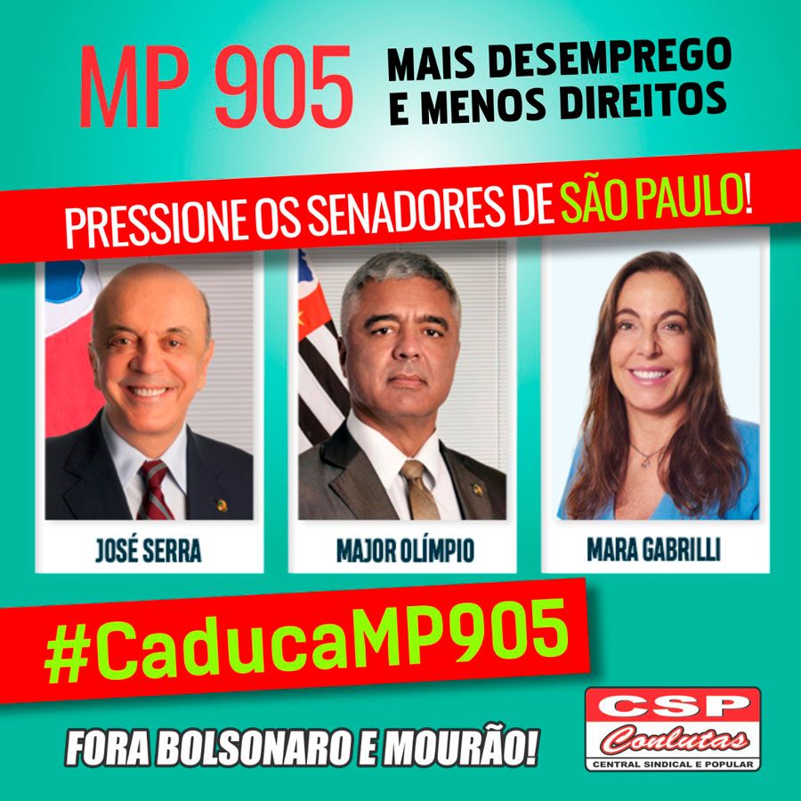A Medida Provisória nº 905 caduca às 24 horas de hoje, dia 20, se não for votada no Senado. Por isso, estas últimas horas precisarão ser de pressão total sobre os senadores para que de fato não votem o texto e deixem essa MP nefasta caducar.