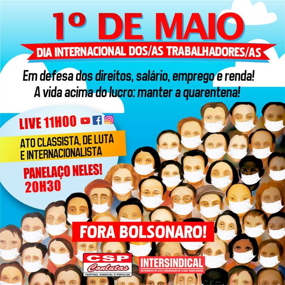 A CSP-Conlutas defende que neste 1º de Maio, mais do que nunca, se faz necessário a realização de um ato classista, que esteja a serviço da defesa da vida diante da pandemia do coronavírus, dos empregos, direitos, da renda básica para todos que precisam e, principalmente, para fortalecer a luta para botar para Fora Bolsonaro e Mourão!