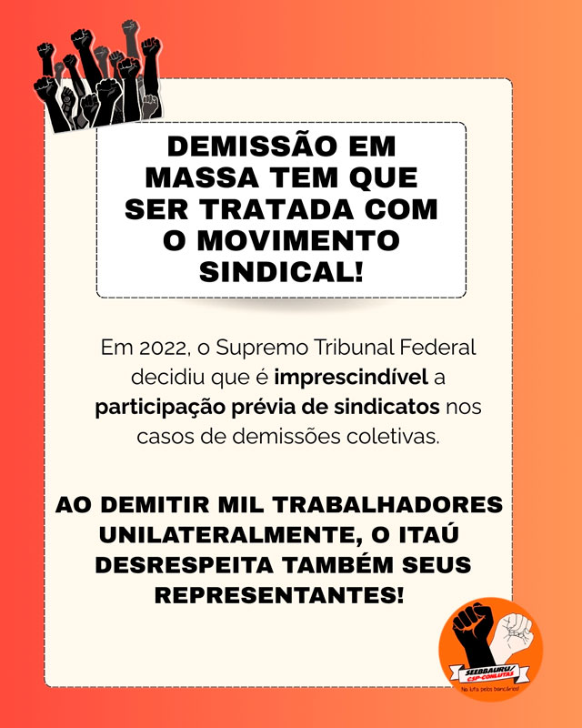 O Itaú surpreendeu seus trabalhadores e o movimento sindical no dia 8, com a demissão sem justa causa de cerca de mil funcionários de diversos setores que atuavam em regime híbrido ou remoto. Em nota, o banco informou que a decisão foi tomada após uma “revisão criteriosa de condutas relacionadas ao trabalho remoto e registro de jornada”.