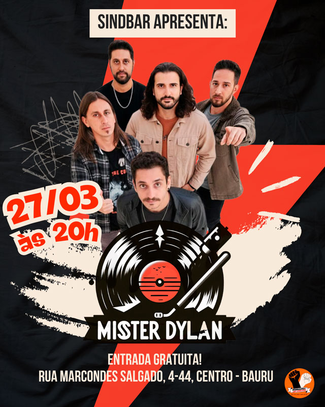 O SindBar, evento do Sindicato dos Bancários de Bauru e Região, recebe na última sexta-feira do mês, 27 de março, às 20h, a banda de pop rock Mister Dylan. A entrada é gratuita e aberta a todo o público.