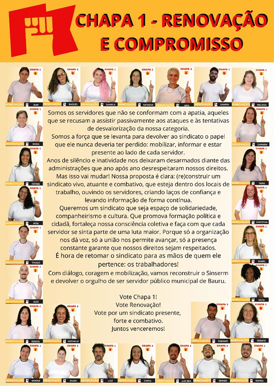 A Chapa 1 é composta por servidores de base, com anos de experiência no funcionalismo público, comprometidos em resgatar o verdadeiro propósito de um sindicato: lutar e defender os trabalhadores, não se acomodar diante do poder e não se acovardar ou se aliar aos governos opressores.