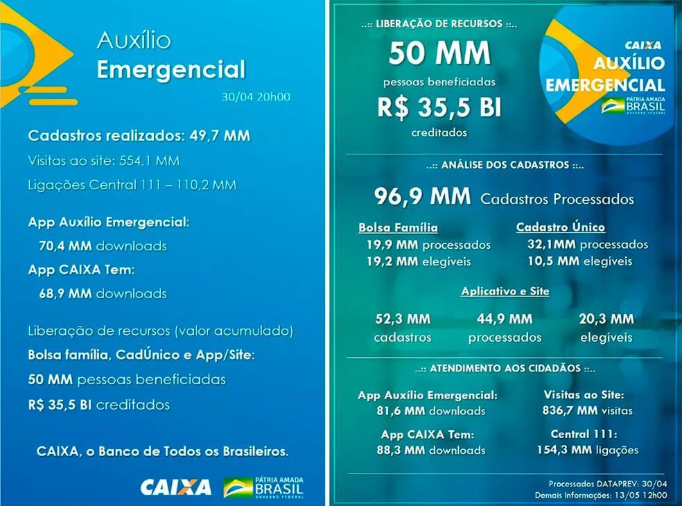 Isso porque o banco divulgou ontem, 13, o último balanço dos pagamentos do auxílio e dele constam os mesmos números informados em 30 de abril — R$ 35,5 bilhões creditados a 50 milhões de brasileiros.