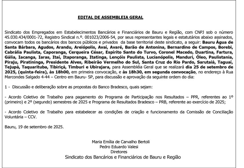 O Sindicato dos Bancários de Bauru e Região realiza em sua sede, no dia 25 de setembro, às 18h30 (horário limite), uma assembleia para os funcionários do Bradesco deliberarem sobre os seguintes pontos: