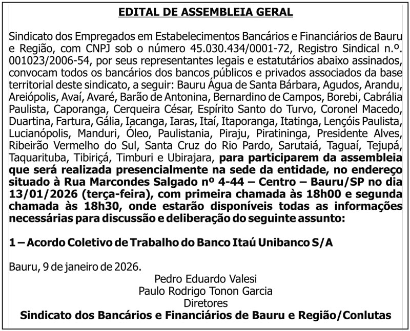 O Sindicato dos Bancários de Bauru e Região realiza em sua sede na próxima terça-feira, dia 13, às 18h30 (horário limite), uma assembleia para discussão e deliberação do Acordo Coletivo de Trabalho do Itaú, com vigência em 2026.
