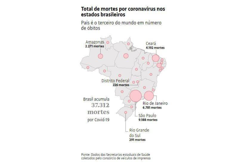 O consórcio de veículos de imprensa — formado por jornalistas dos sites G1 e UOL e dos jornais O Globo, Extra, O Estado de S. Paulo e Folha de S.Paulo — revelou na noite de ontem que o Brasil teve 849 novas mortes registradas em razão do novo coronavírus nas últimas 24 horas e que registrou, até segunda-feira, 37.312 mortes por coronavírus.