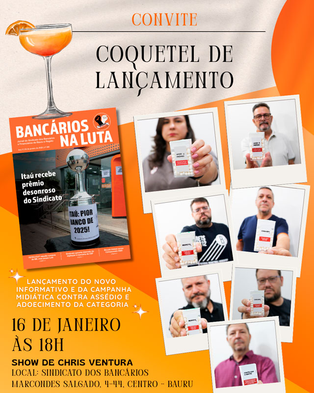 O Sindicato dos Bancários de Bauru e Região convida a todos a participarem do coquetel de lançamento do novo modelo do jornal Bancários na Luta e da campanha midiática “É preciso reagir ao assédio e ao adoecimento!”. O evento será realizado a partir das 18h, na sede da entidade, localizada na rua Marcondes Salgado, 4-44, no Centro de Bauru, e contará com o show do cantor Chris Ventura.