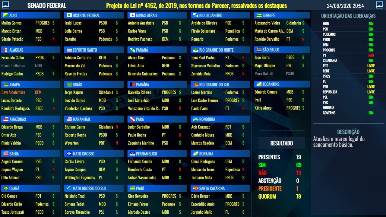 O Senado aprovou ontem (24), em sessão remota, o novo marco legal do saneamento básico com 65 votos favoráveis e somente 13 contrários. O Projeto de Lei (PL) 4.162/2019, iniciativa do governo Bolsonaro, facilita a privatização da água, já que transforma os contratos em vigor em concessões com a empresa privada que vier a assumir a estatal e torna obrigatório a abertura de licitação, possibilitando a participação de empresas públicas e privadas.