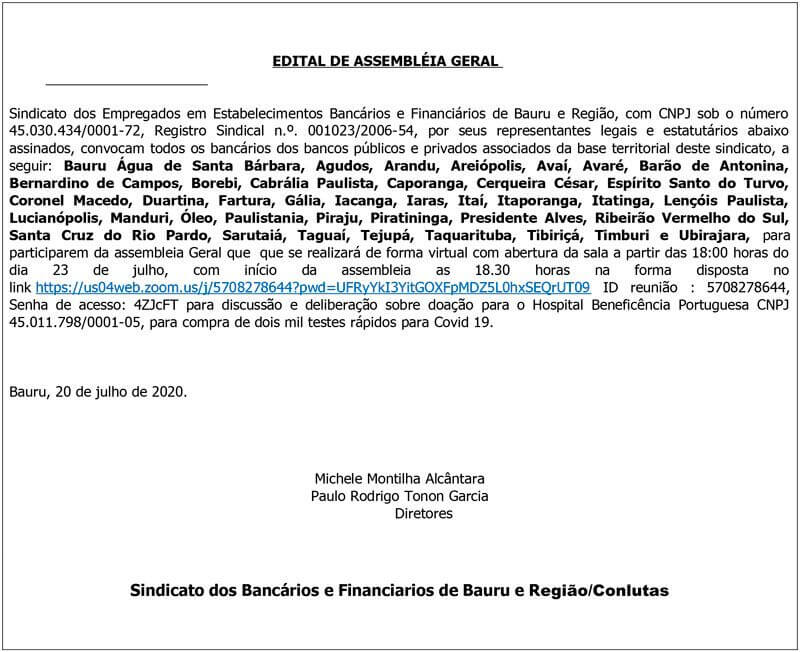 O Sindicato dos Bancários de Bauru e Região realizará uma assembleia virtual na quinta-feira (23), às 18h30, para discutir e deliberar sobre a possível doação para o Hospital Beneficência Portuguesa, para compra de dois mil testes rápidos para Covid-19.