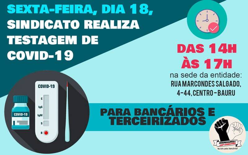 O Sindicato irá realizar novamente testagens de Covid-19, amanhã (18), das 14h às 17h, na sede da entidade, localizada na rua Marcondes Salgado, 4-44, Centro.