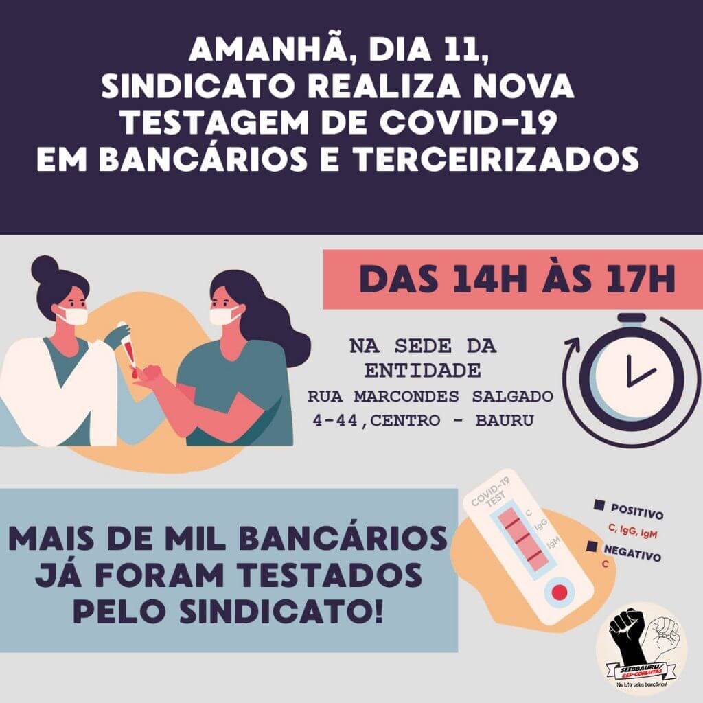 Amanhã (11), das 14h às 17h, o Sindicato dos Bancários de Bauru e Região realiza em sua sede mais uma série de testagem gratuita de Covid-19 em bancários e terceirizados.
