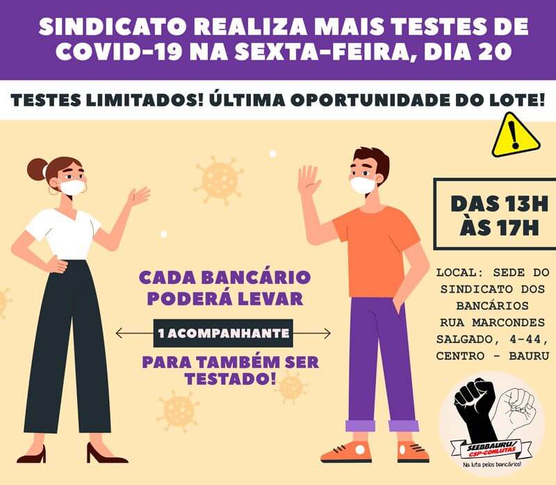 O Sindicato dos Bancários de Bauru e Região realiza amanhã, dia 20, das 13h às 17h, a última série de testagens de Covid-19 em bancários e terceirizados. Os exames serão os últimos do lote comprado em agosto pela entidade.
