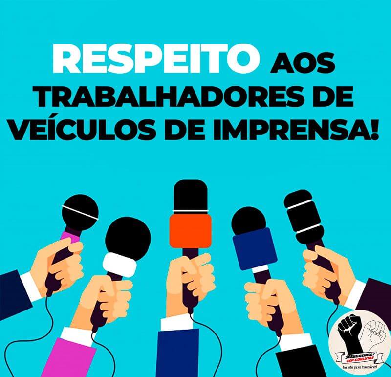 O Sindicato dos Bancários de Bauru e Região se solidariza com todos os trabalhadores de veículos de imprensa que estão sofrendo diversos ataques de bolsonaristas durante o exercício de suas funções, principalmente na cobertura jornalística na porta do Palácio do Alvorada, em Brasília.