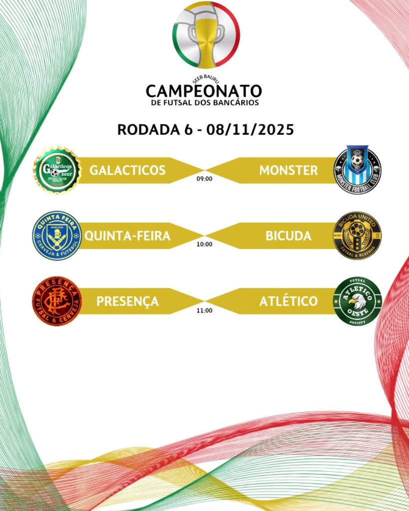 A 6ª rodada acontece neste sábado, 8 de novembro, a partir das 9h, na quadra do Sindicato (rua Marcondes Salgado, 4-44, Centro – Bauru). Os jogos são abertos ao público! Vem assistir!
