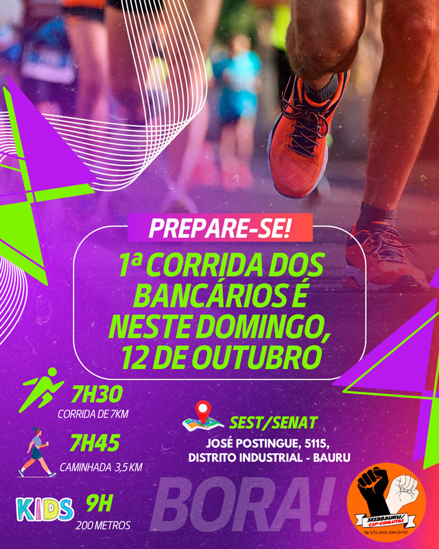 Prepare-se! A 1ª Corrida dos Bancários acontece neste domingo, dia 12 de outubro! O evento, promovido pelo Sindicato dos Bancários de Bauru e Região, tem como objetivo incentivar a prática da atividade física, visando bem estar físico e mental, além de promover integração entre os participantes. Veja abaixo detalhes da programação!