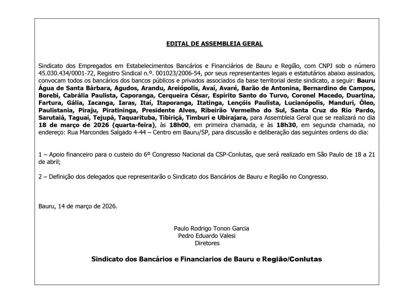 O Sindicato dos Bancários de Bauru e Região realizará, na próxima quarta-feira (18), às 18h30, em sua sede, uma assembleia para discutir e deliberar sobre o apoio financeiro destinado ao custeio do 6º Congresso Nacional da CSP-Conlutas. Na ocasião, também serão definidos os delegados que representarão a entidade no evento, que ocorrerá de 18 a 21 de abril, no Clube Guapira, em São Paulo.