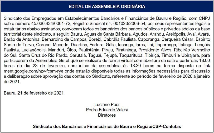 O Sindicato dos Bancários de Bauru e Região realiza no próximo dia 23, a partir das 18 horas, sua assembleia anual de prestação de contas. A assembleia será virtual, através do link meet.google.com/nzv-fcsm-rye/.