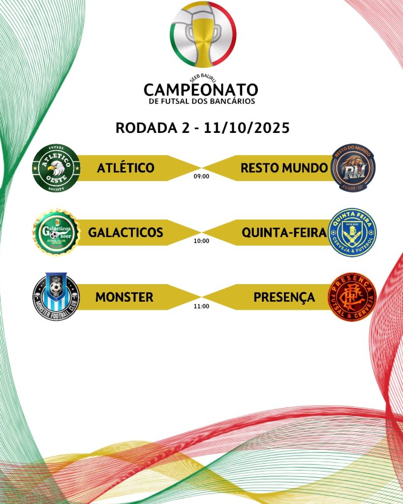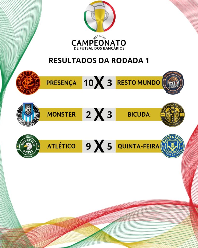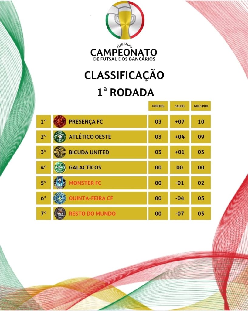 Veja abaixo os resultados da 1ª rodada, a classificação e quem lidera a artilharia. A 2ª rodada acontece no dia 11 de outubro, a partir das 9h, na quadra poliesportiva do Sindicato (Marcondes Salgado, 4-44, Bauru).