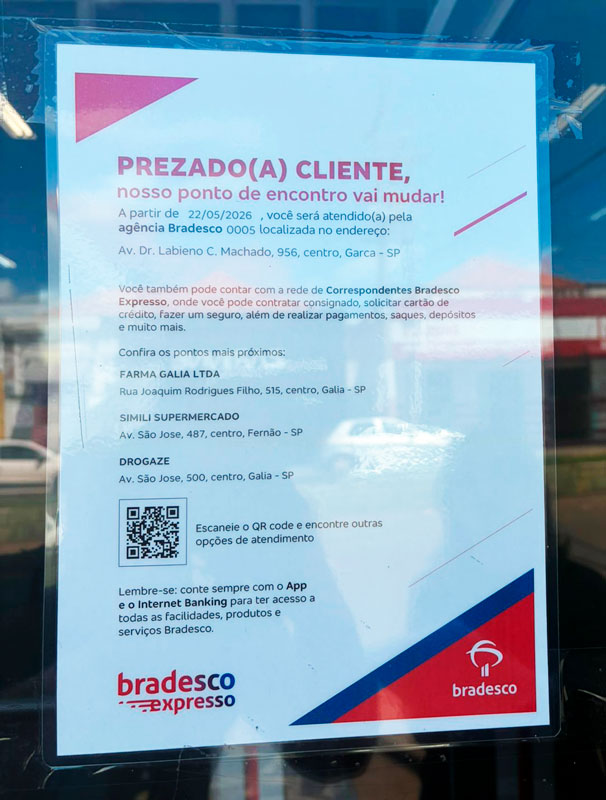 Um aviso fixado na agência de Gália informa que, a partir de 25 de maio, o atendimento será transferido para Garça. Como alternativa, absurdamente, o banco orienta a população a buscar serviços em correspondentes bancários, como farmácias e um supermercado.