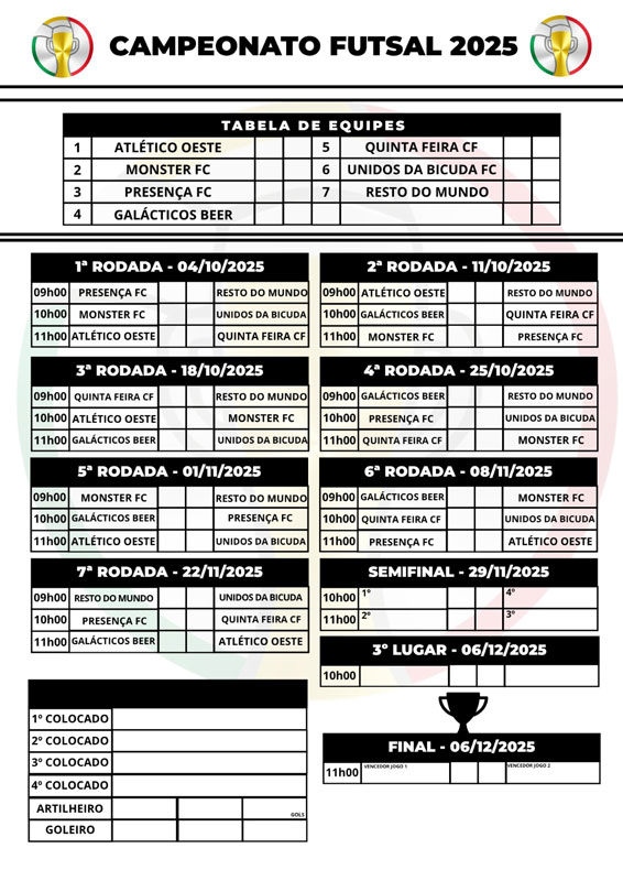 O tradicional Campeonato de Futsal do Sindicato dos Bancários de Bauru e Região tem início neste sábado, dia 4 de outubro. Neste ano, sete times se inscreveram e vão disputar o tão sonhado troféu de campeão. Confira abaixo os horários e confrontos: