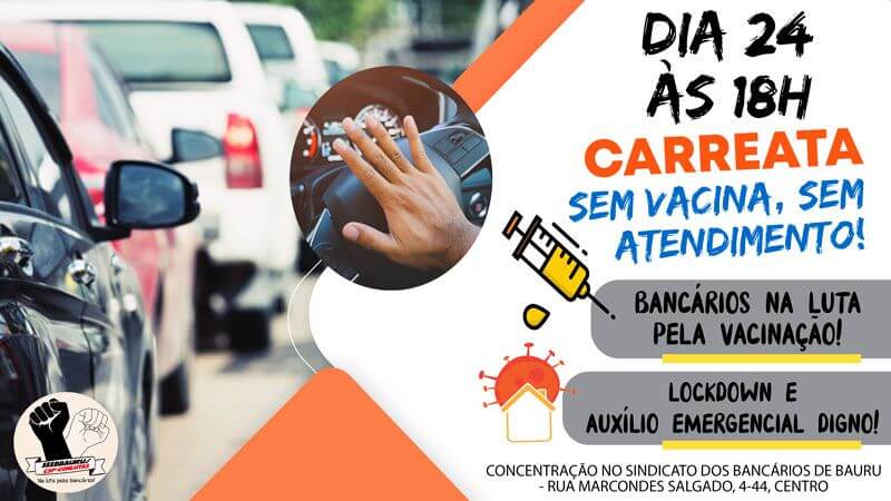 O Sindicato dos Bancários de Bauru e Região vai promover nesta quarta-feira (24), a partir das 18 horas, a carreata “Sem vacina, sem atendimento!” para protestar contra a demora na vacinação dos trabalhadores da categoria, que desde o começo da pandemia, estão gravemente expostos ao risco de contágio por coronavírus. Além disso, a manifestação pedirá “Lockdown já, com auxílio emergencial digno!”.