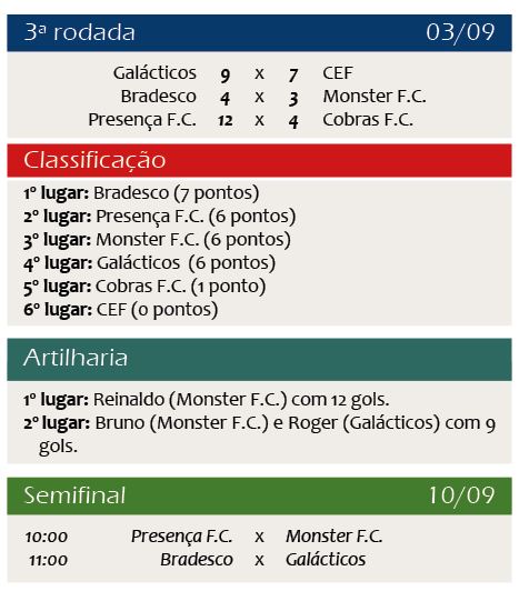 A 3ª rodada do Campeonato de Futsal do Sindicato dos Bancários de Bauru e Região aconteceu no último sábado, dia 3. Veja a seguir os resultados dos confrontos, os horários dos jogos da semifinal, que acontece no sábado, dia 10, e a classificação atual.