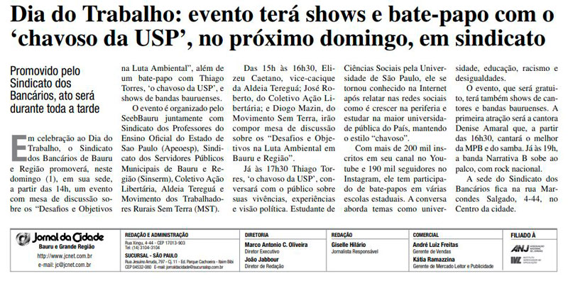 O Jornal da Cidade publicou hoje (27), uma reportagem sobre o evento que será realizado neste domingo, 1º de Maio, na sede do Sindicato dos Bancários de Bauru e Região, a partir das 14 horas. A celebração, em comemoração ao Dia do Trabalhador, contará com mesa de discussão sobre os “Desafios e Objetivos na Luta Ambiental”, além de um bate-papo com Thiago Torres, ‘o chavoso da USP’, e shows de bandas bauruenses.