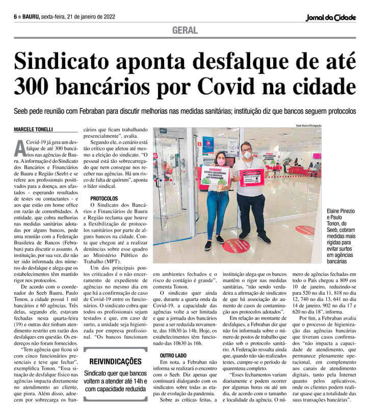 O Jornal da Cidade publicou hoje (21), uma reportagem sobre a alta de casos de Covid-19 entre os bancários das agências de Bauru. Paulo Tonon, diretor do Sindicato dos Bancários de Bauru e Região e bancário do BB, concedeu entrevista ao jornal e explicou que estima-se que há desfalque de 300 bancários na cidade.