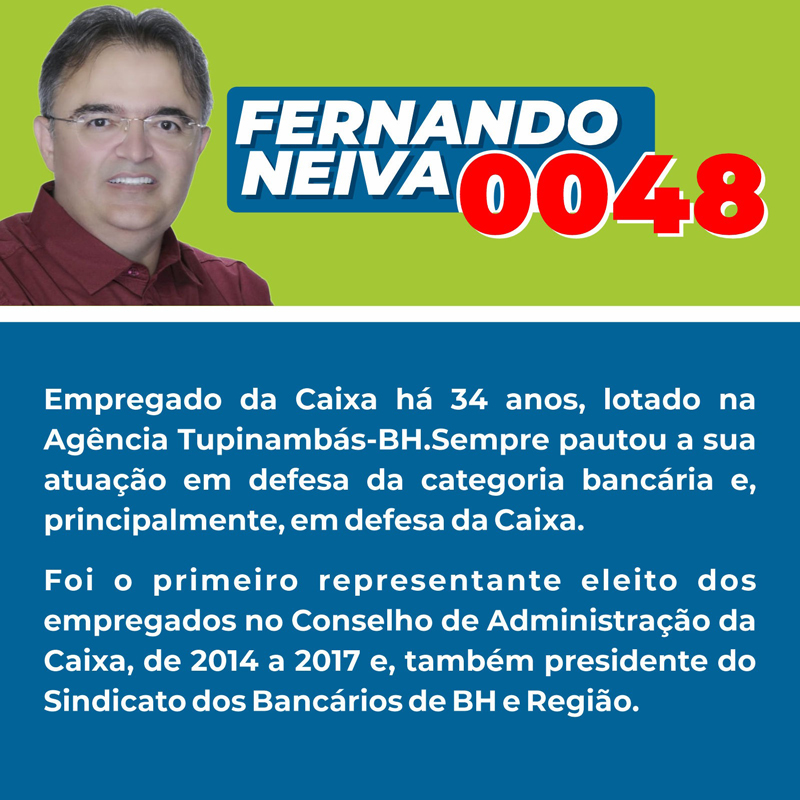 Fernando Neiva é piauiense e mora em Minas Gerais há mais de 47 anos. É bancário da Caixa desde 1989. Atualmente, está lotado na agência Tupinambás, em Belo Horizonte (MG). Ele foi o primeiro representante eleito dos empregados no Conselho de Administração da Caixa, de 2014 a 2017 e, também, presidente do Sindicato dos Bancários de Belo Horizonte por três gestões (1999-2008), além de diretor da Fenae e presidente do Conselho Fiscal da APCEF – MG.