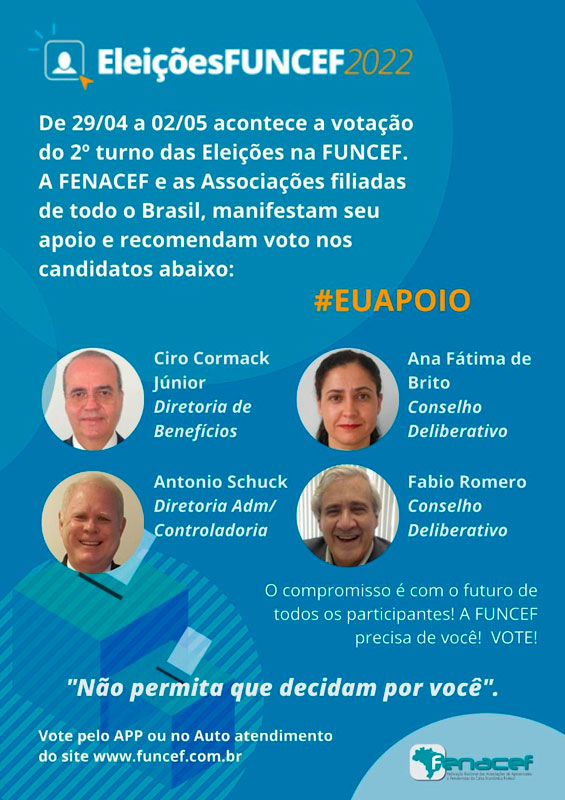 O segundo turno das Eleições Funcef se encerra nesta segunda-feira, dia 2. Neste ano, a Frente Nacional de Oposição Bancária (FNOB) apoia Ciro Cormack Jr, Ana Fátima de Brito, Gilson Tavares Costa, Vilmar Pereira da Rocha, Fabiano Nascimento da Silva e Paulo Germano da Costa Alves (veja imagem).