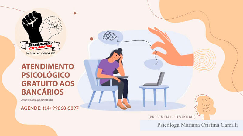 O Sindicato dos Bancários de Bauru e Região oferece atendimento psicológico gratuito aos bancários sindicalizados. Desde o ano passado, a entidade contava com duas psicólogas para realizar os atendimentos, no entanto, a profissional Ana Letícia San Juan, por motivos pessoais, não poderá mais dar continuidade à parceria, por isso, a psicóloga Mariana Cristina Camilli segue com o trabalho e irá atender mais de um dia na semana, além das habituais quartas-feiras. A entidade agradece o trabalho realizado por mais de um ano por Ana Letícia.