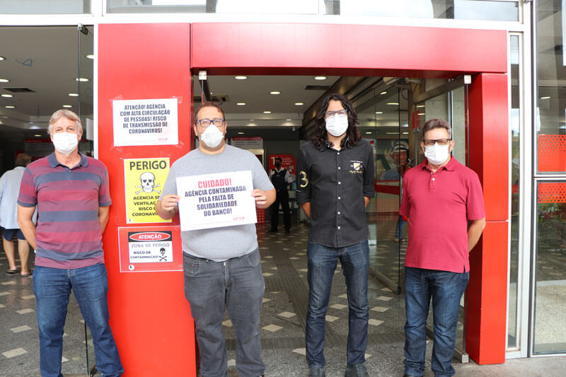 Por conta dessa situação, o Sindicato também realizou um protesto na agência, denunciando o péssimo protocolo do banco em um momento de avanço da pandemia no País. Ao decorrer do protesto, um cliente do banco denunciou que não havia álcool em gel nas dependências da agência. Imediatamente, o Sindicato solicitou à Regional – com o carro de som – para que o produto fosse fornecido aos clientes, no entanto, o banco sequer respondeu à solicitação. A fim de solucionar rapidamente o problema, a entidade comprou unidades de álcool em gel e distribuiu no autoatendimento.
