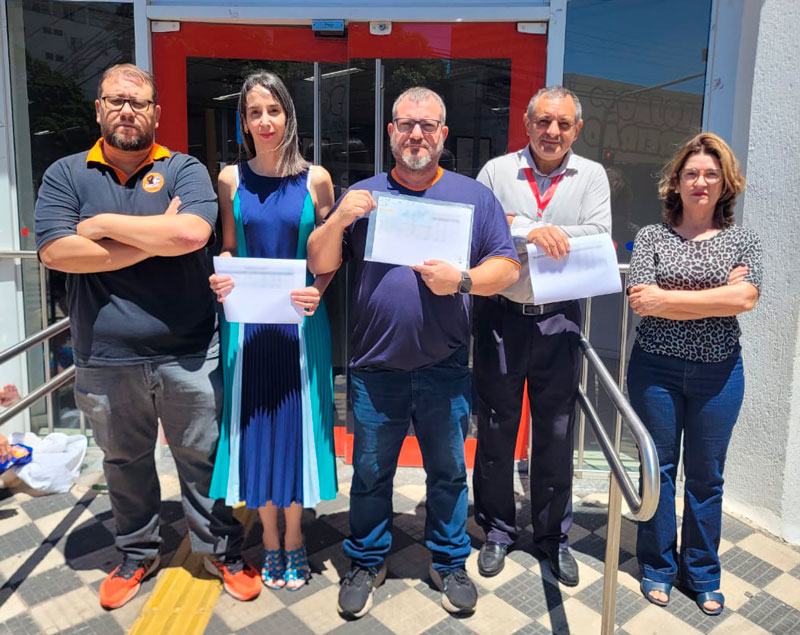 (Foto: Tonon, Mariene, Palharim, Aloísio e Maria Emília, diretores do Sindicato, entregam cheques aos bancários do Bradesco da Ezequiel Ramos)