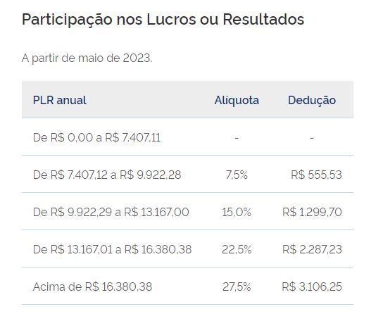 O governo Lula reajustou, em maio deste ano, a tabela do Imposto de Renda sobre a PLR de 2023. A alteração foi feita na faixa de isenção da tabela (veja no gráfico abaixo), que passou dos R$ 6.677,55 para os atuais R$ 7.407,11, um reajuste de 10,93%, ou seja, ampliou-se a faixa de isenção da PLR. A tabela do IR na PLR não sofria alteração desde 2015.