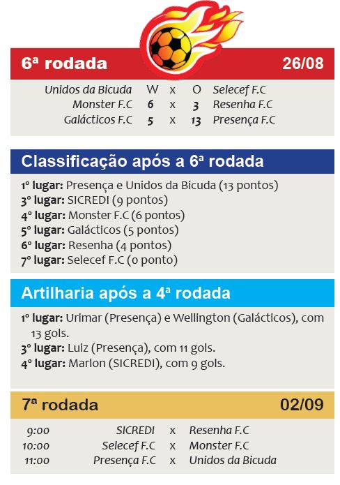 No dia 26, aconteceu a sexta rodada do Campeonato de Futsal 2023 do Sindicato dos Bancários de Bauru e Região. Veja a seguir os resultados dos confrontos, a classificação atual, artilharia e os horários dos jogos da sétima rodada, que será no dia 2 de setembro.